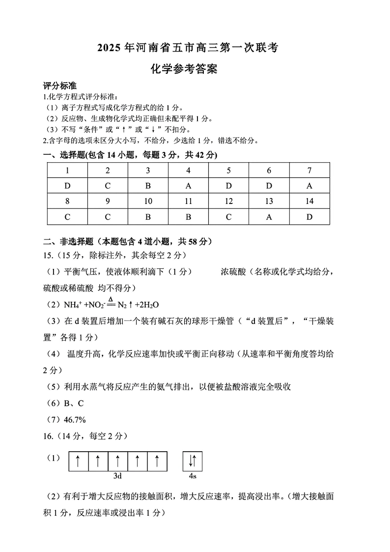 河南省(驻马店、漯河、南阳、信阳、三门峡)五市2025年高三第一次联考 化学答案.pdf