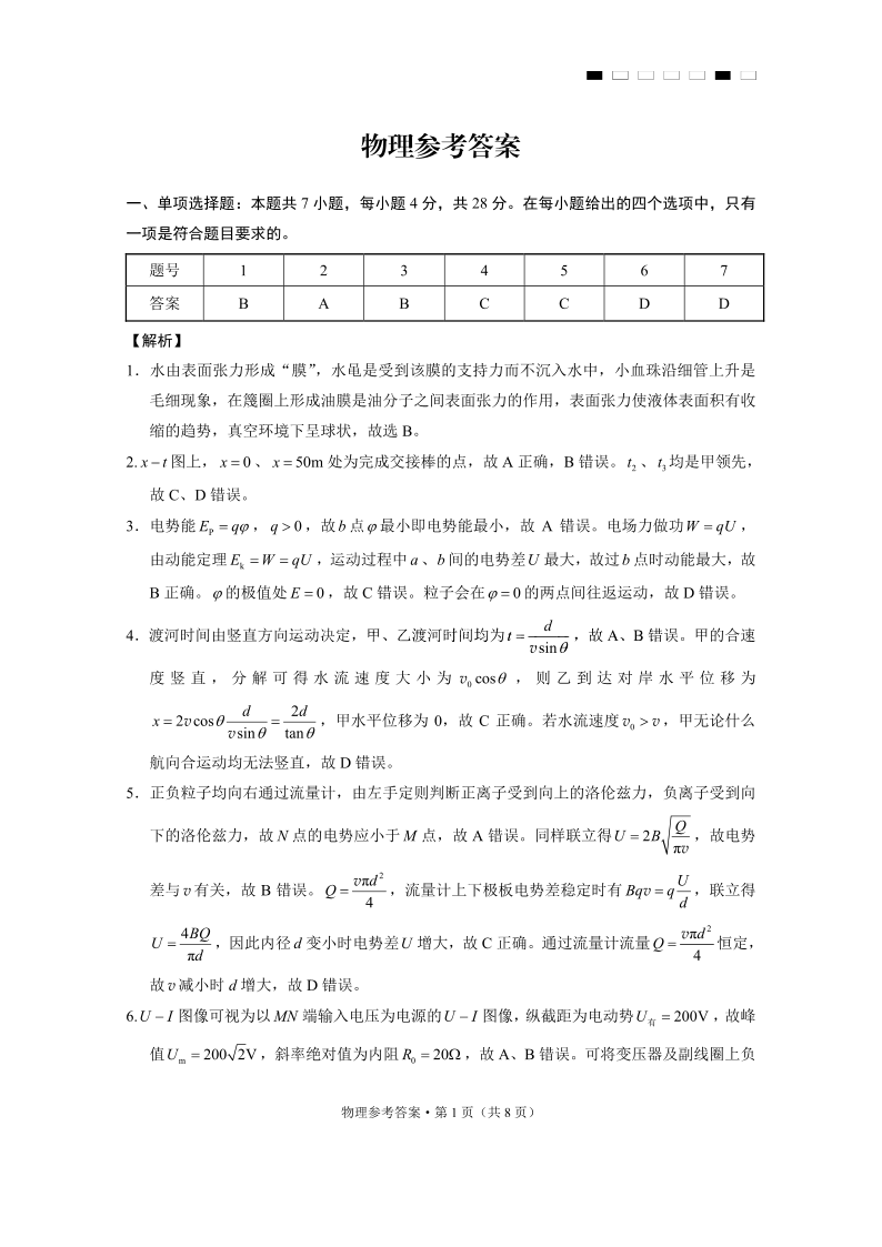 重庆市第八中学2025届高三3月适应性月考卷(六)物理答案.pdf