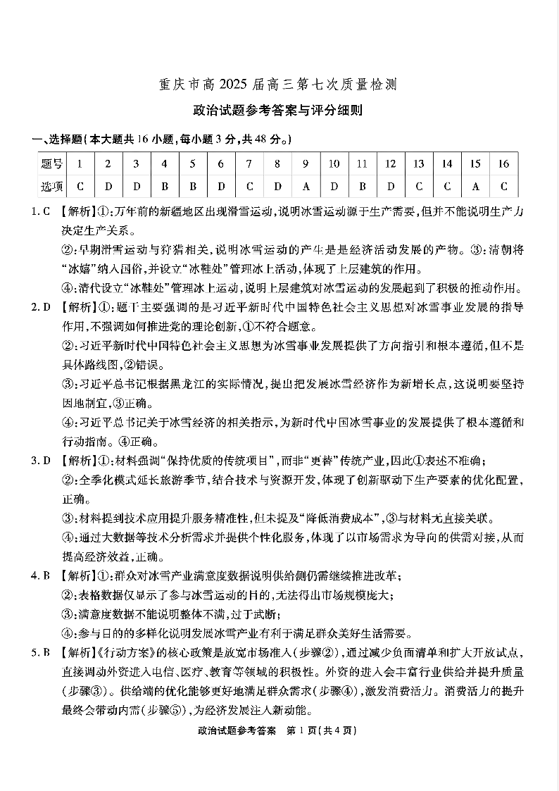 重庆市南开中学高2025届高三第七次质量检测 政治答案.pdf