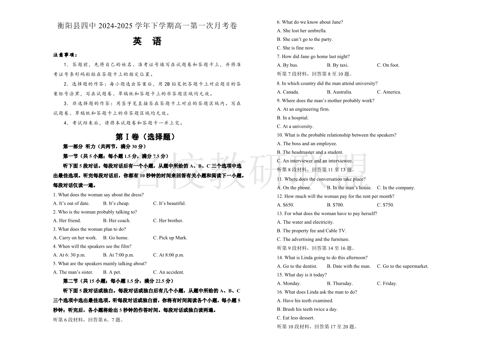 衡阳县四中2024-2025学年下学期高一第一次月考卷 英语(含答案).pdf