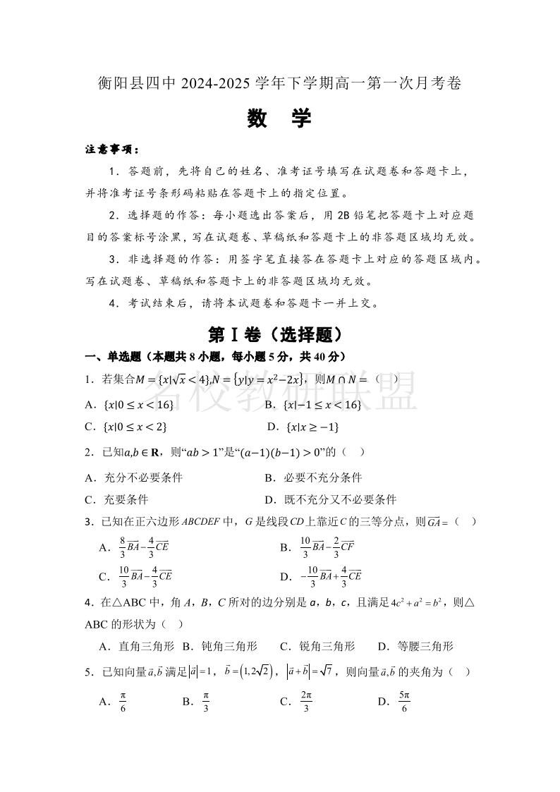 衡阳县四中2024-2025学年下学期高一第一次月考卷 数学(含答案).pdf