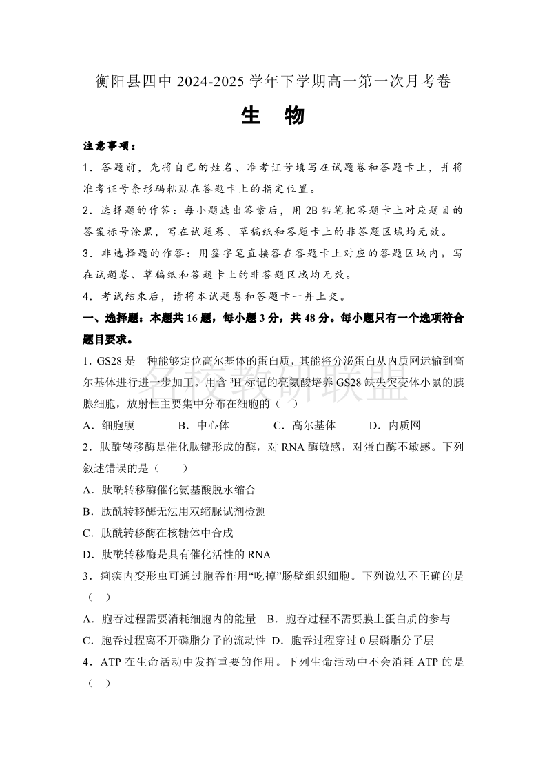 衡阳县四中2024-2025学年下学期高一第一次月考卷 生物(含答案).pdf