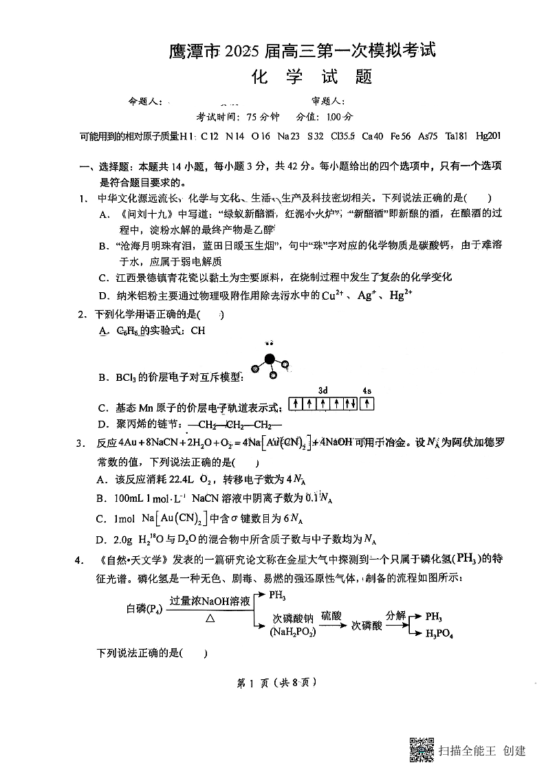 江西省鹰潭市2025届高三下学期第一次模拟考试 化学.pdf