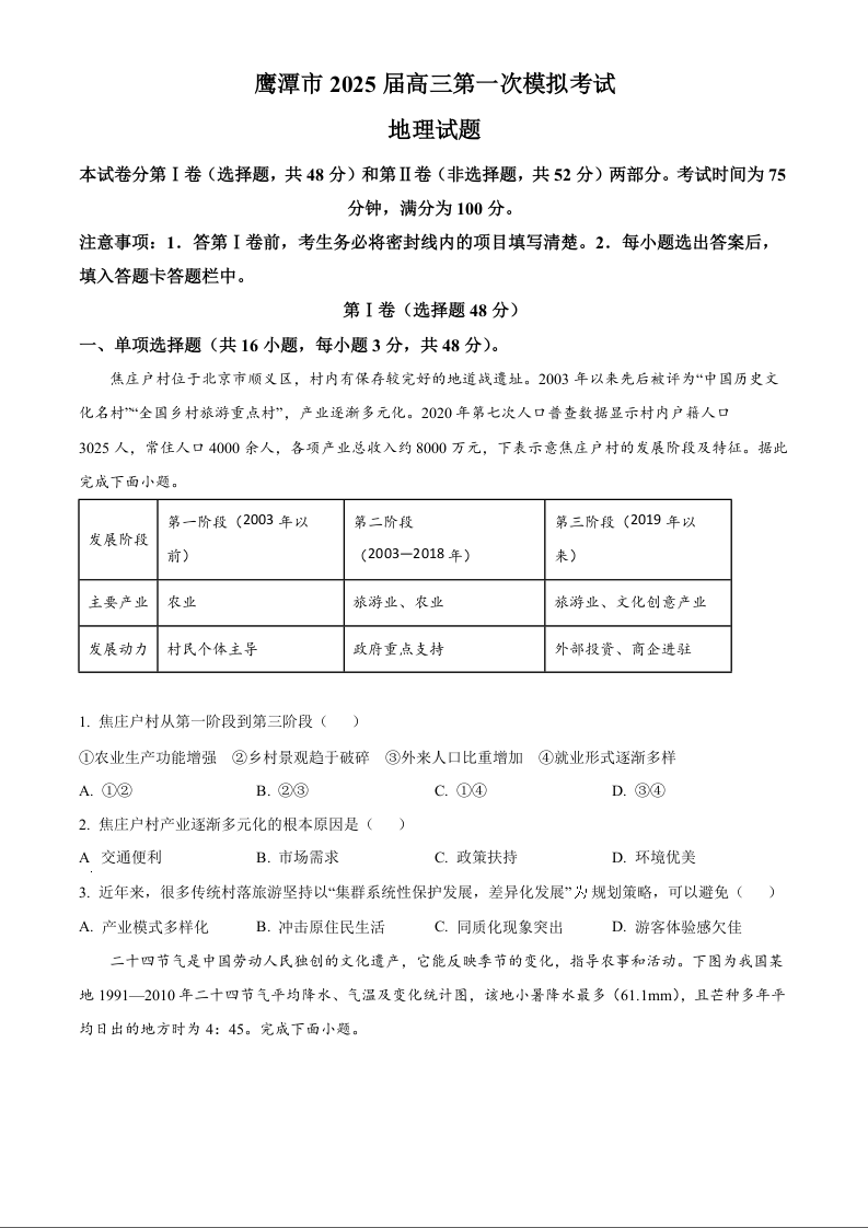 江西省鹰潭市2025届高三下学期第一次模拟考试 地理(含答案).docx