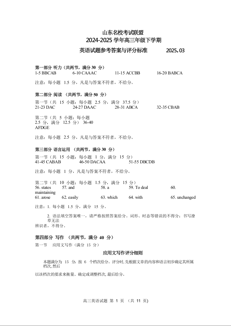 山东名校考试联盟2025年3月高考模拟考试 英语答案.docx