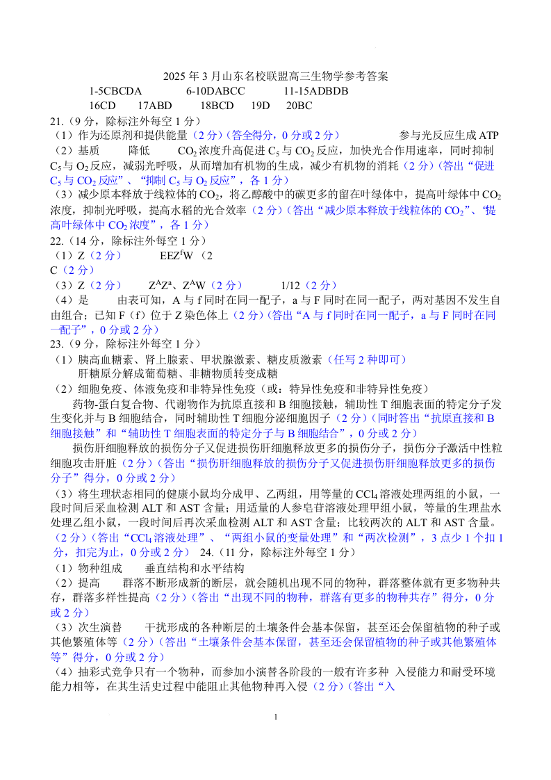 山东名校考试联盟2025年3月高考模拟考试 生物答案.docx