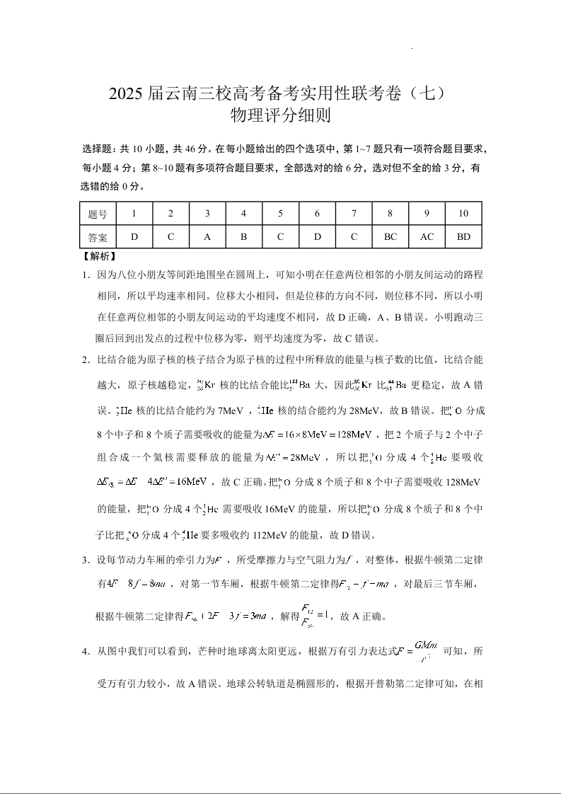 2025届云南三校高考备考实用性联考卷(七)物理答案.docx