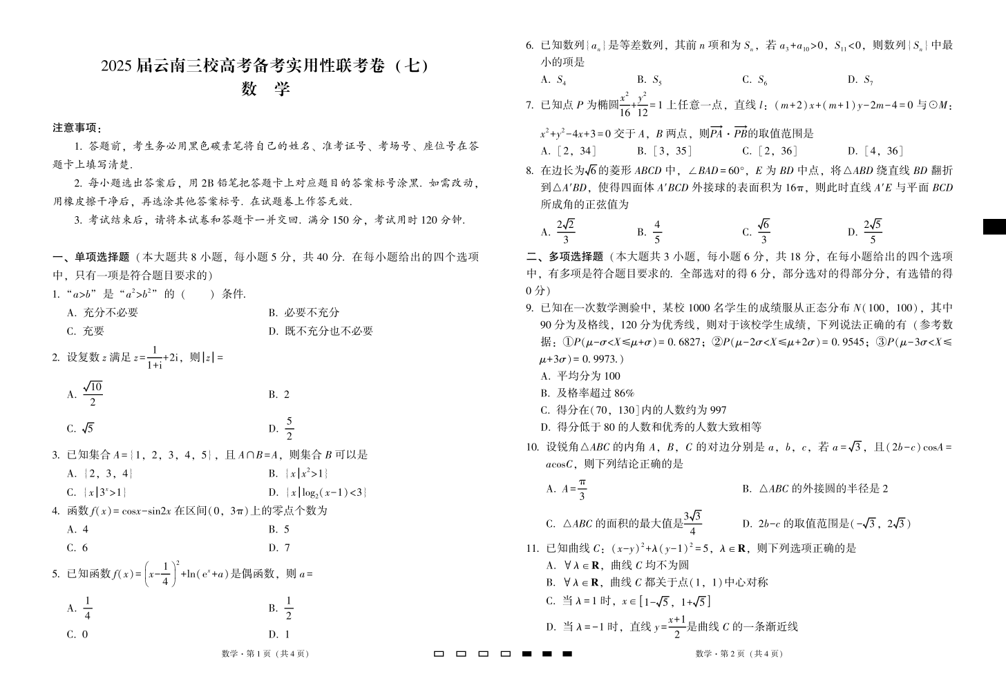 2025届云南三校高考备考实用性联考卷(七)数学.pdf