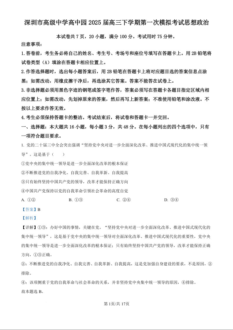广东省深圳市高级中学高中园2025届高三下学期第一次模拟考试 政治答案.docx