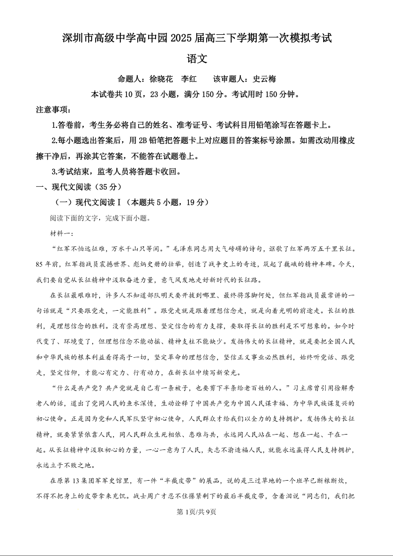 广东省深圳市高级中学高中园2025届高三下学期第一次模拟考试 语文.docx