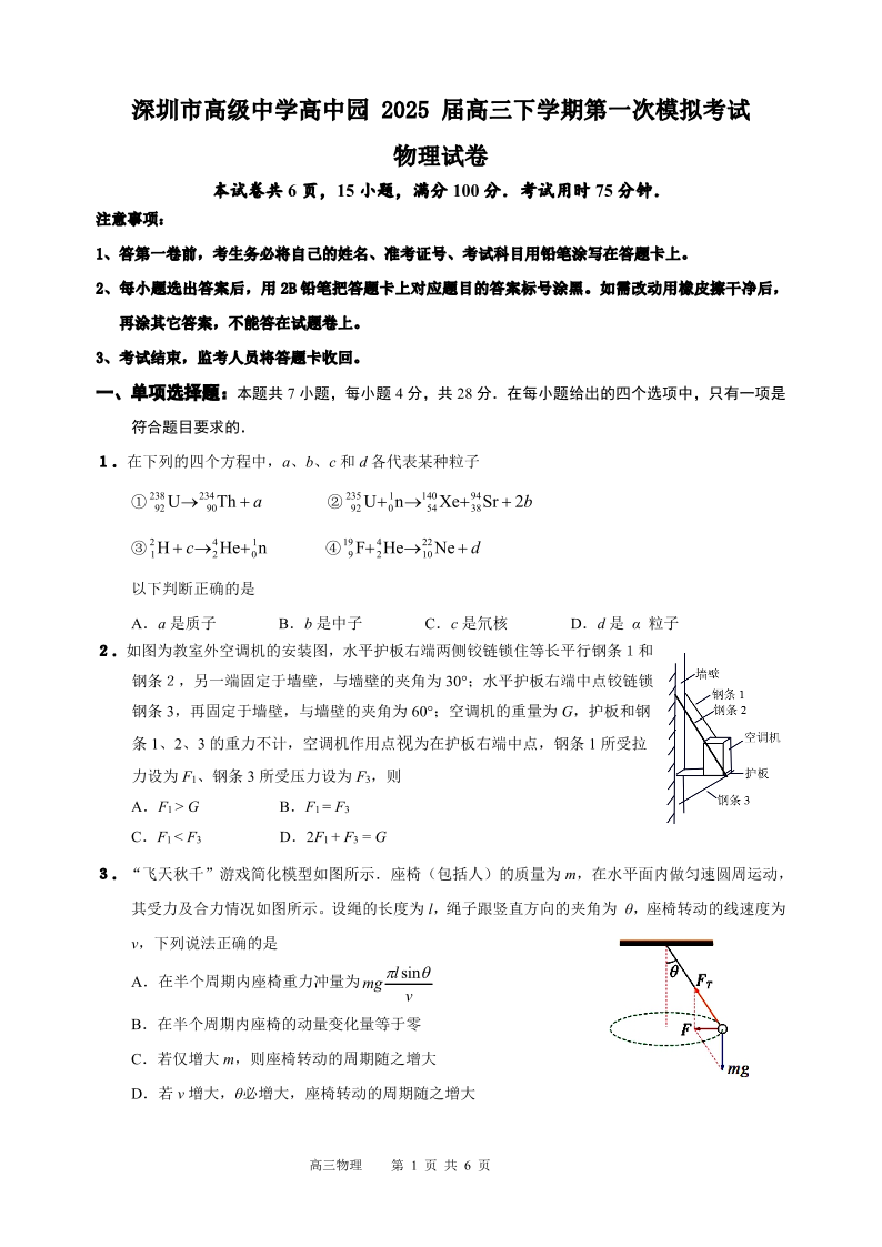广东省深圳市高级中学高中园2025届高三下学期第一次模拟考试 物理.pdf