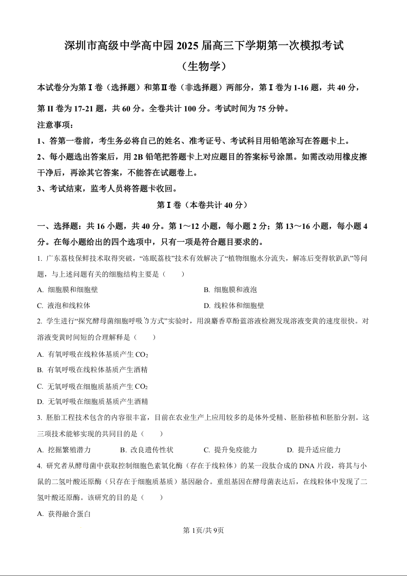 广东省深圳市高级中学高中园2025届高三下学期第一次模拟考试 生物.docx