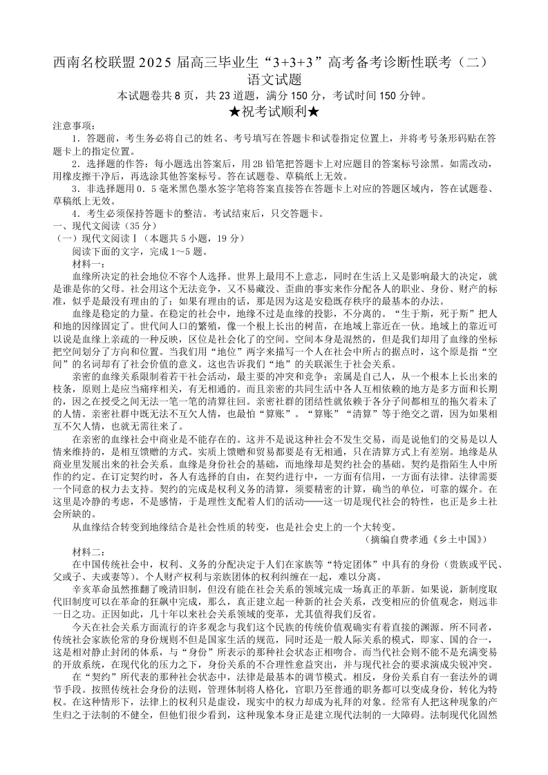 西南名校联盟2025届”3+3+3“高考备考诊断性联考(二)语文(含答案).docx