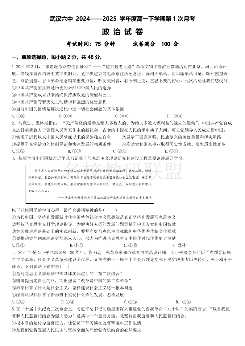 湖北省武汉市第六中学2024-2025学年高一下学期第1次月考 政治.pdf