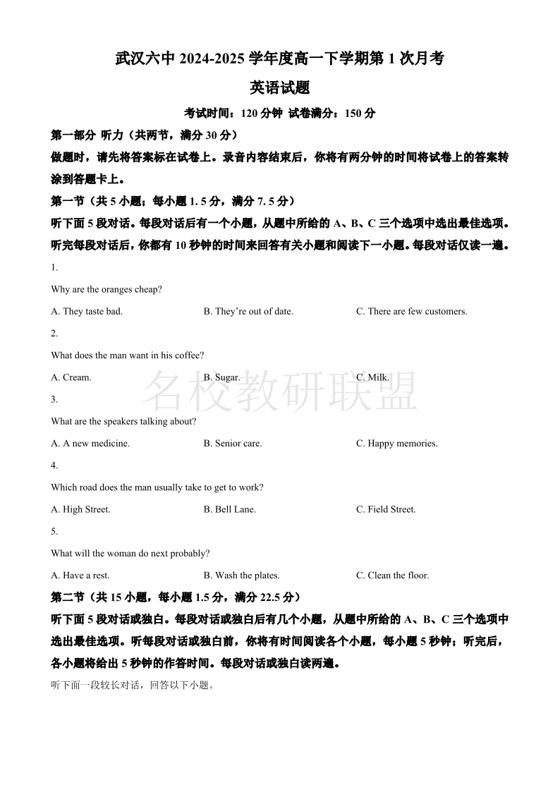湖北省武汉市第六中学2024-2025学年高一下学期第1次月考 英语(含答案).pdf