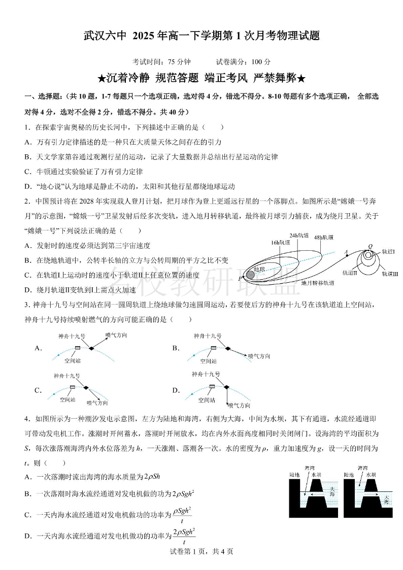 湖北省武汉市第六中学2024-2025学年高一下学期第1次月考 物理.pdf
