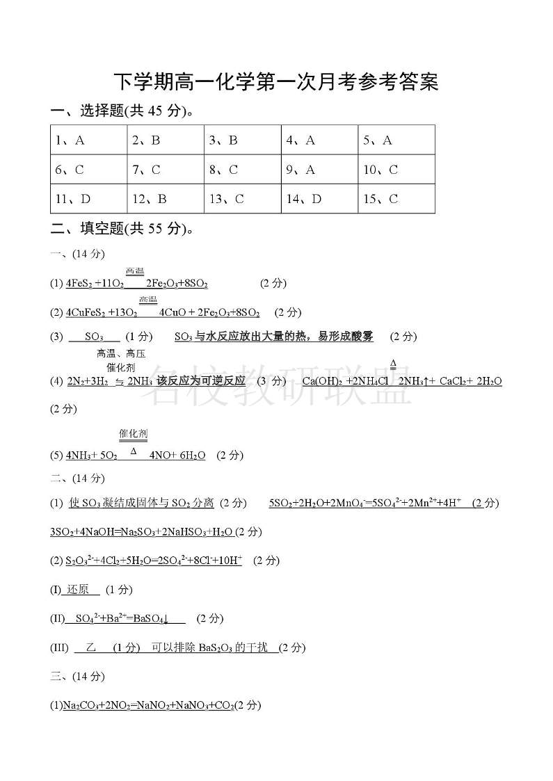湖北省武汉市第六中学2024-2025学年高一下学期第1次月考 化学答案.pdf
