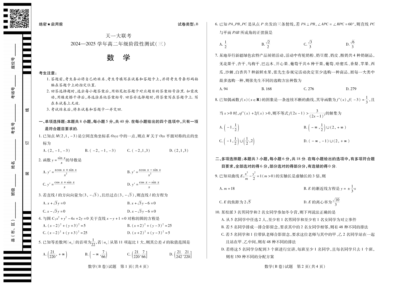 天一大联考·2024-2025学年高二阶段性测试(三)数学B卷.pdf