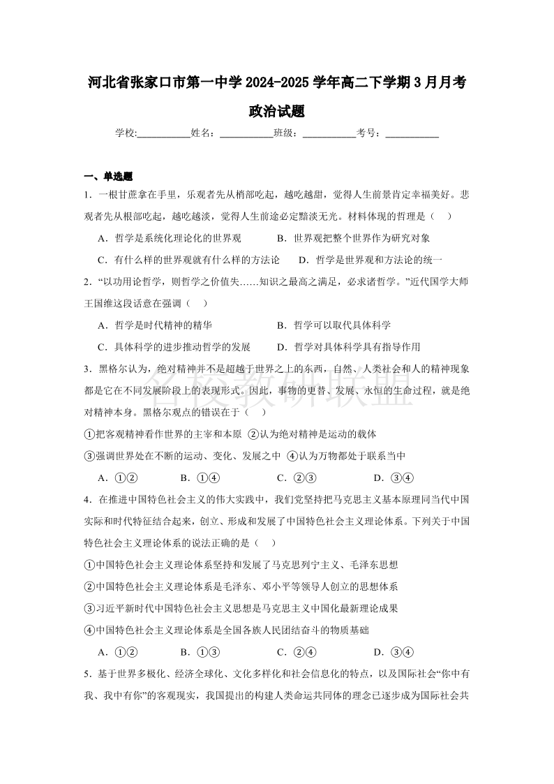 河北省张家口市第一中学2024-2025学年高二下学期3月月考试题 政治(含答案).pdf