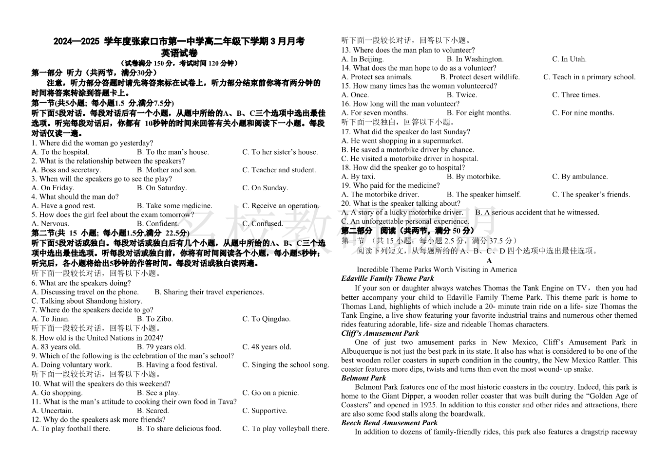 河北省张家口市第一中学2024-2025学年高二下学期3月月考试题 英语(含答案).pdf