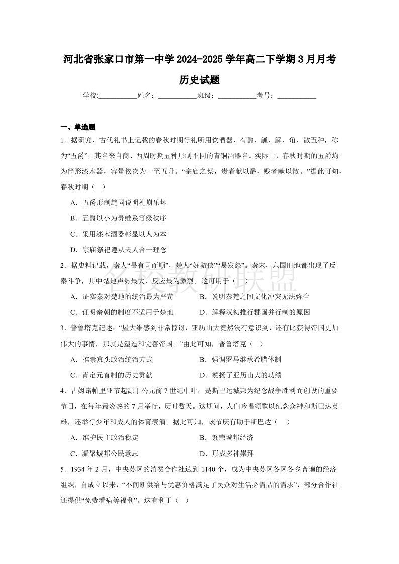 河北省张家口市第一中学2024-2025学年高二下学期3月月考试题 历史(含答案).pdf