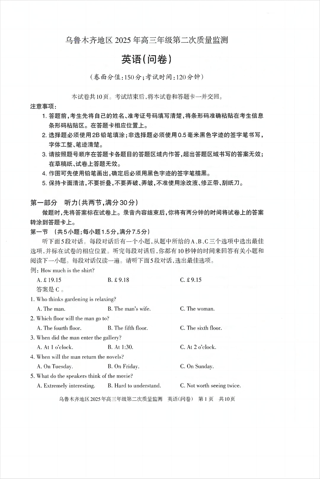 乌鲁木齐地区2025年高三年级第二次质量监测 英语.pdf