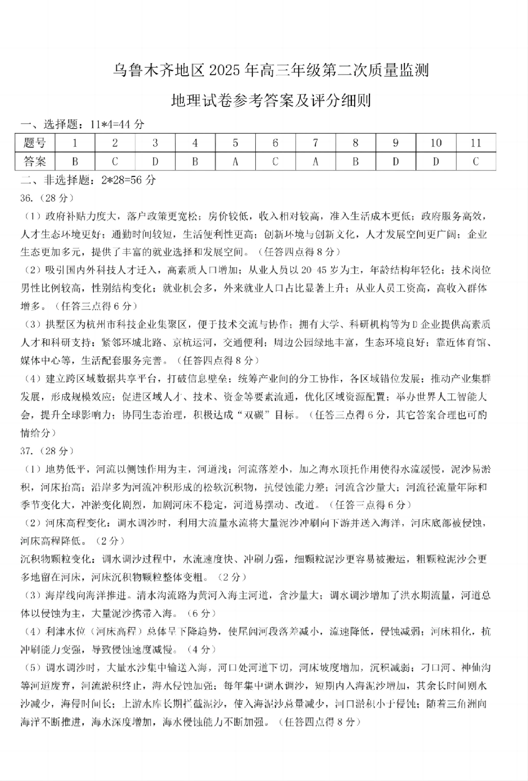 乌鲁木齐地区2025年高三年级第二次质量监测 文综地理答案.pdf