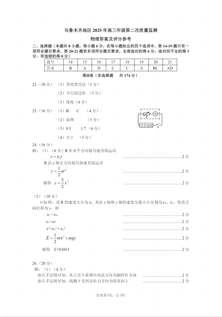 乌鲁木齐地区2025年高三年级第二次质量监测 理综物理答案.pdf
