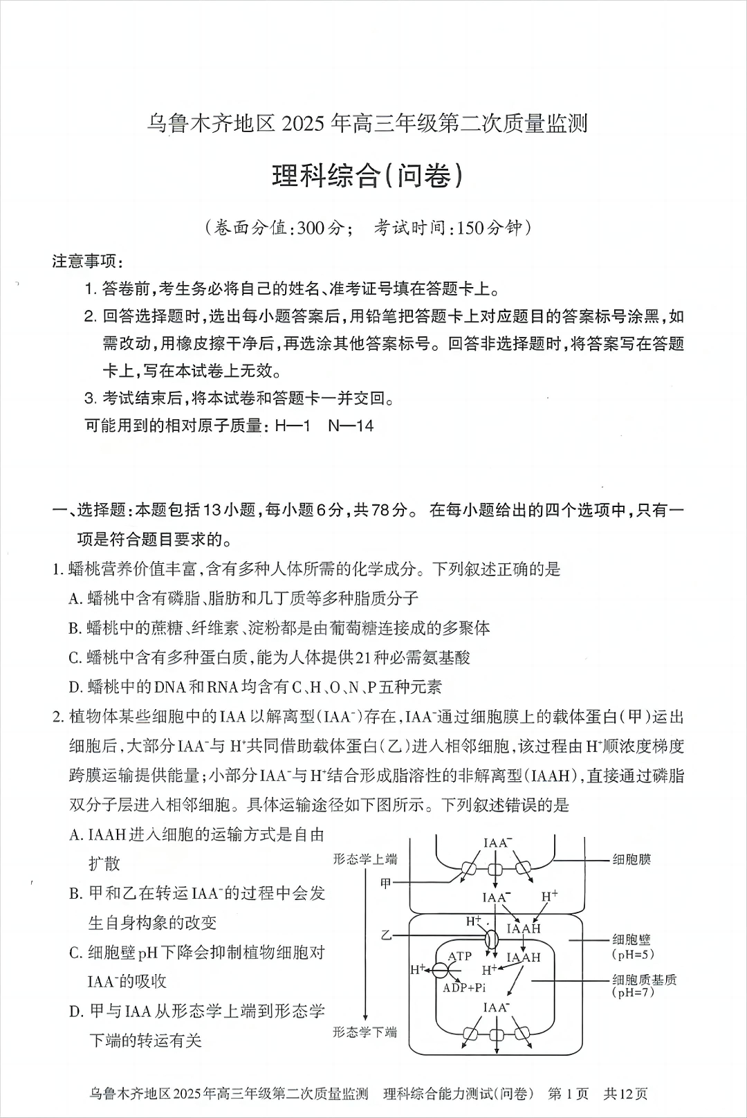 乌鲁木齐地区2025年高三年级第二次质量监测 理综.pdf