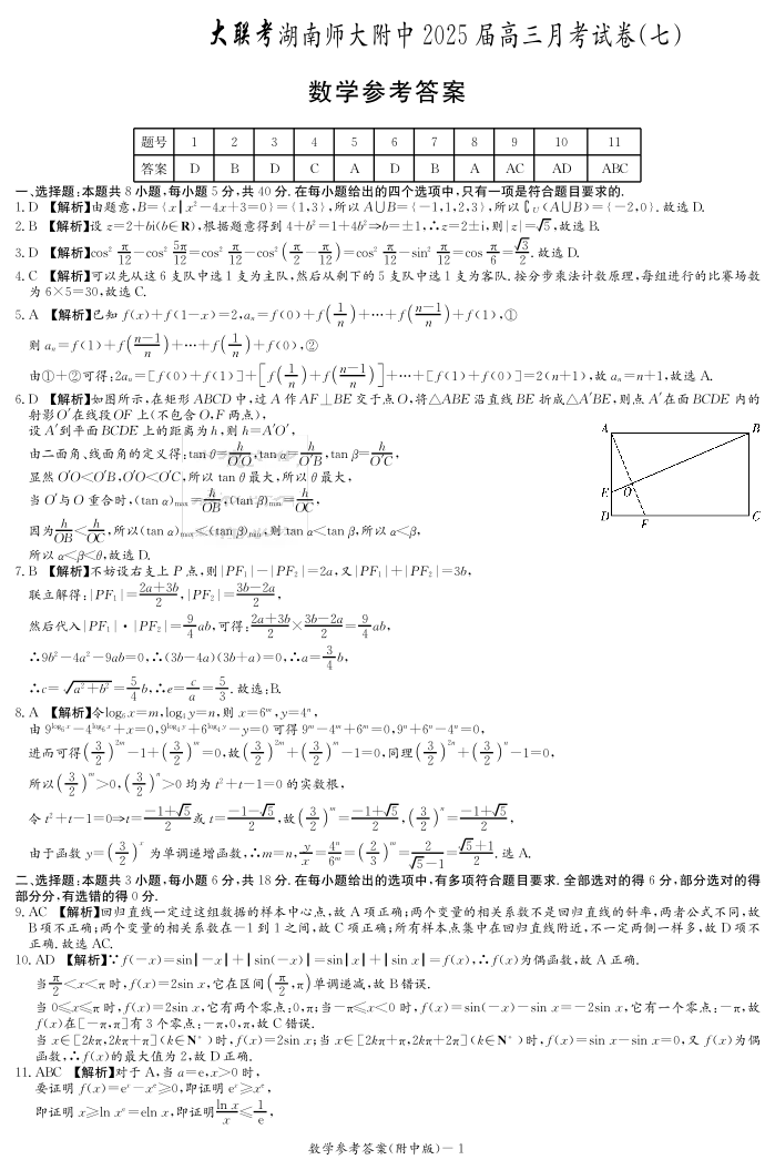 湖南师范大学附属中学2025届高三月考试卷(七)数学参考答案.pdf