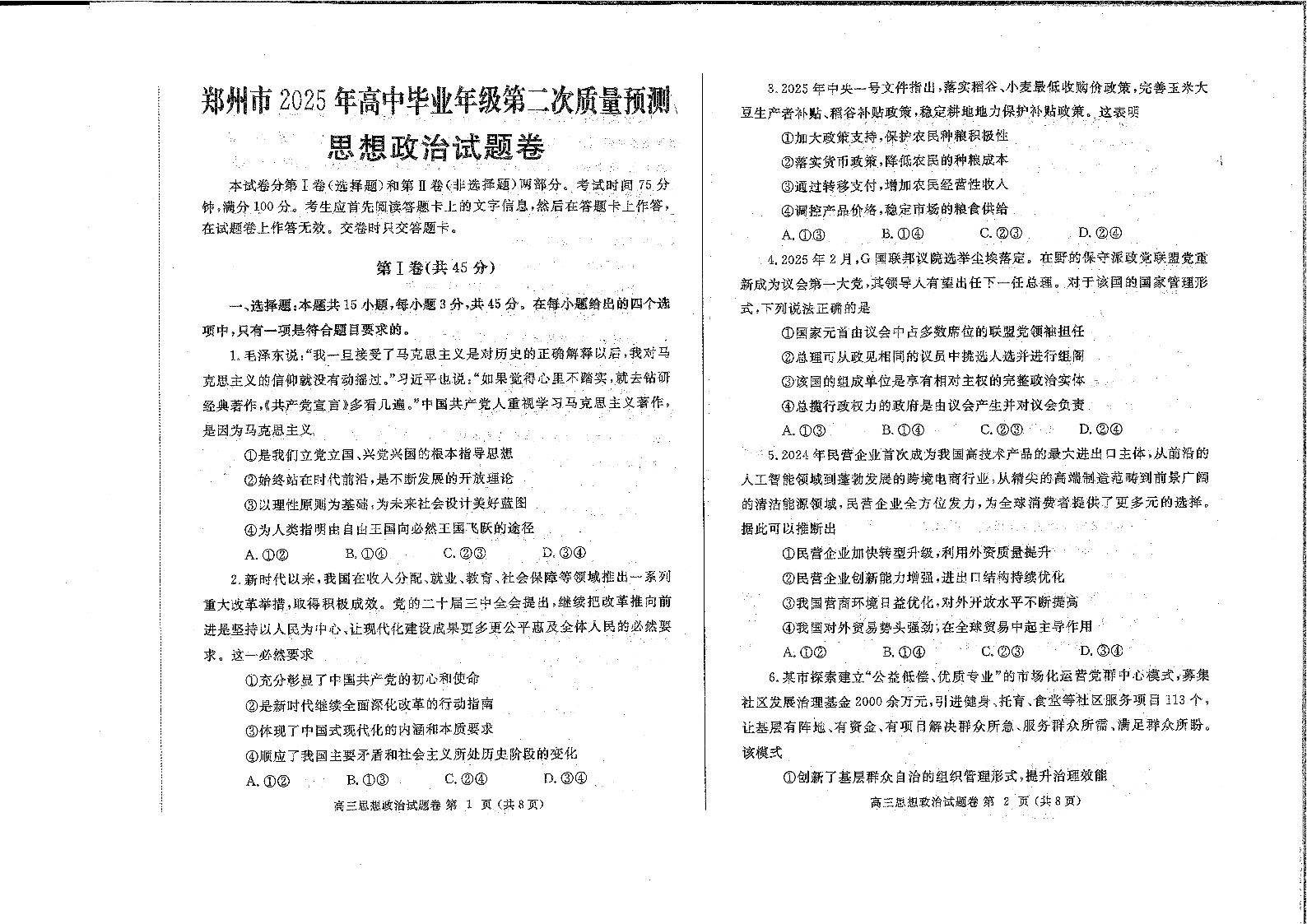 郑州市2025年高中毕业年级第二次质量预测 政治.pdf