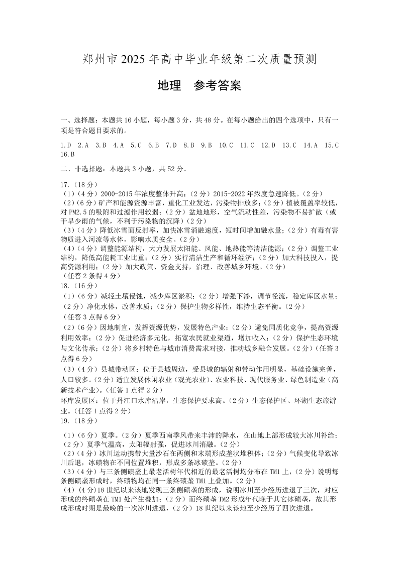 郑州市2025年高中毕业年级第二次质量预测 地理答案.pdf