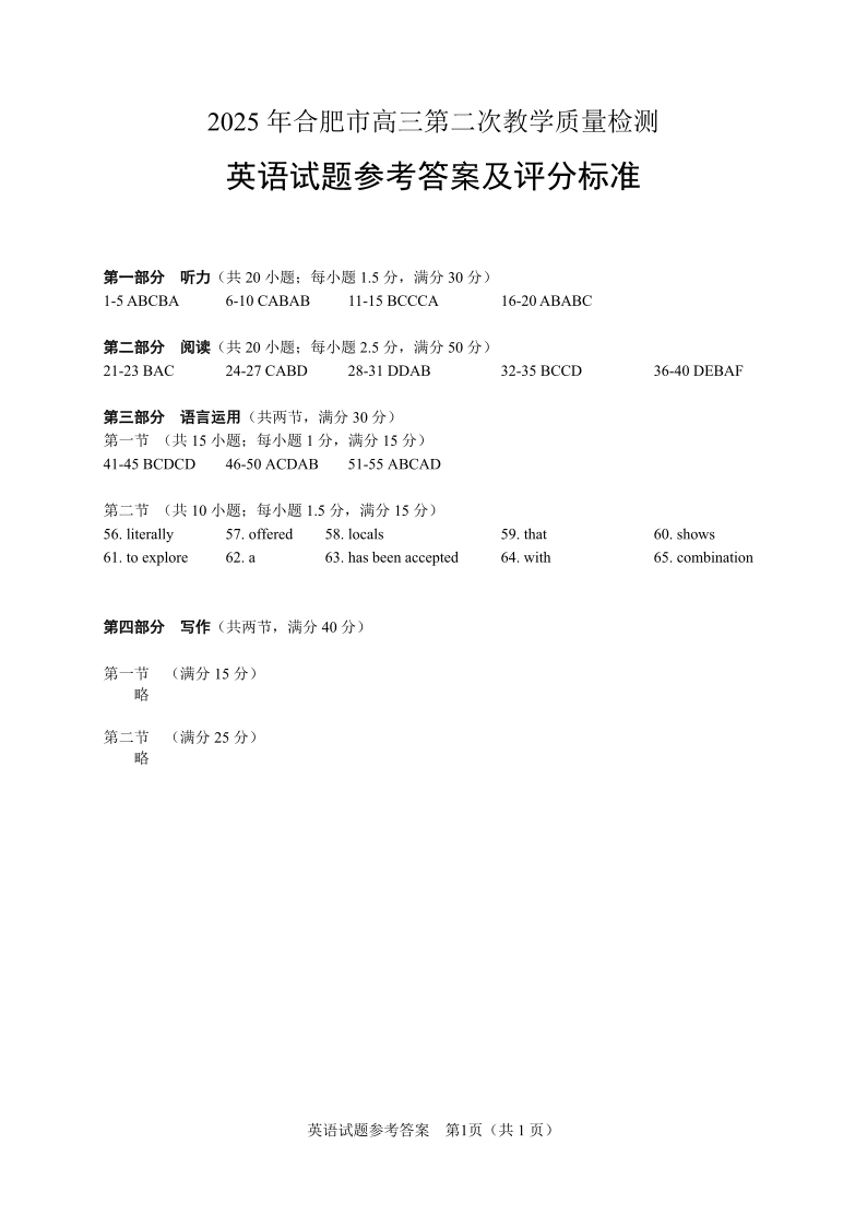 安徽省合肥市2025届高三第二次教学质量检测 英语答案.pdf