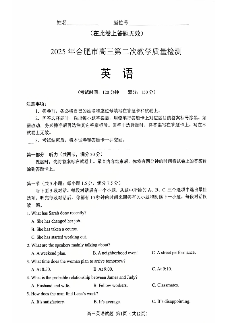 安徽省合肥市2025届高三第二次教学质量检测 英语.pdf
