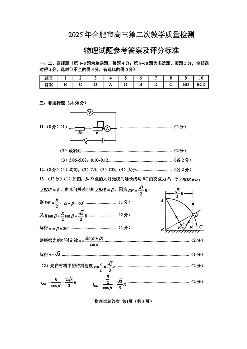 安徽省合肥市2025届高三第二次教学质量检测 物理答案.pdf