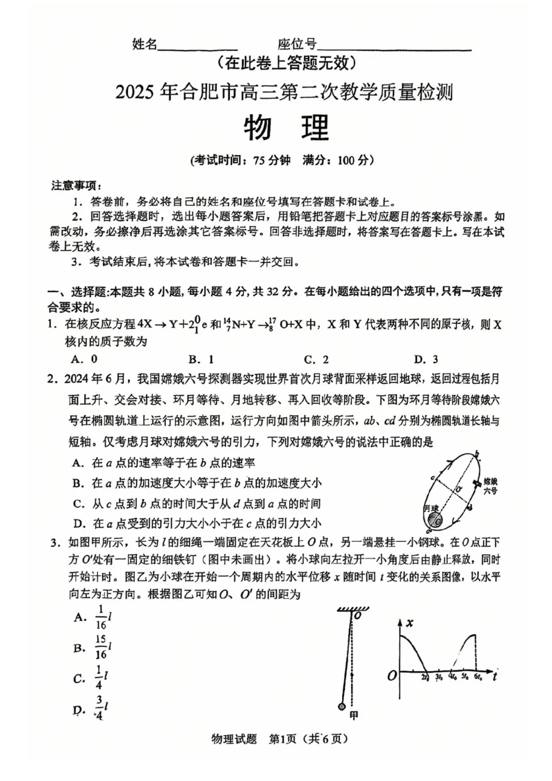 安徽省合肥市2025届高三第二次教学质量检测 物理.pdf
