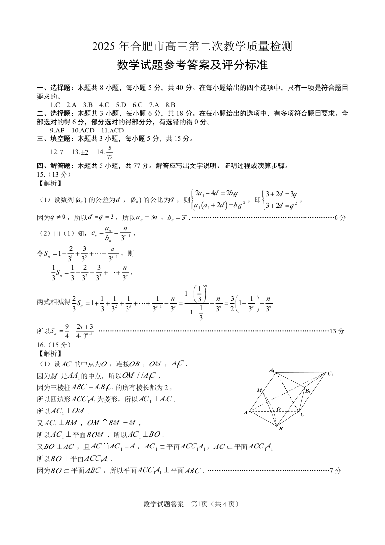 安徽省合肥市2025届高三第二次教学质量检测 数学答案.pdf