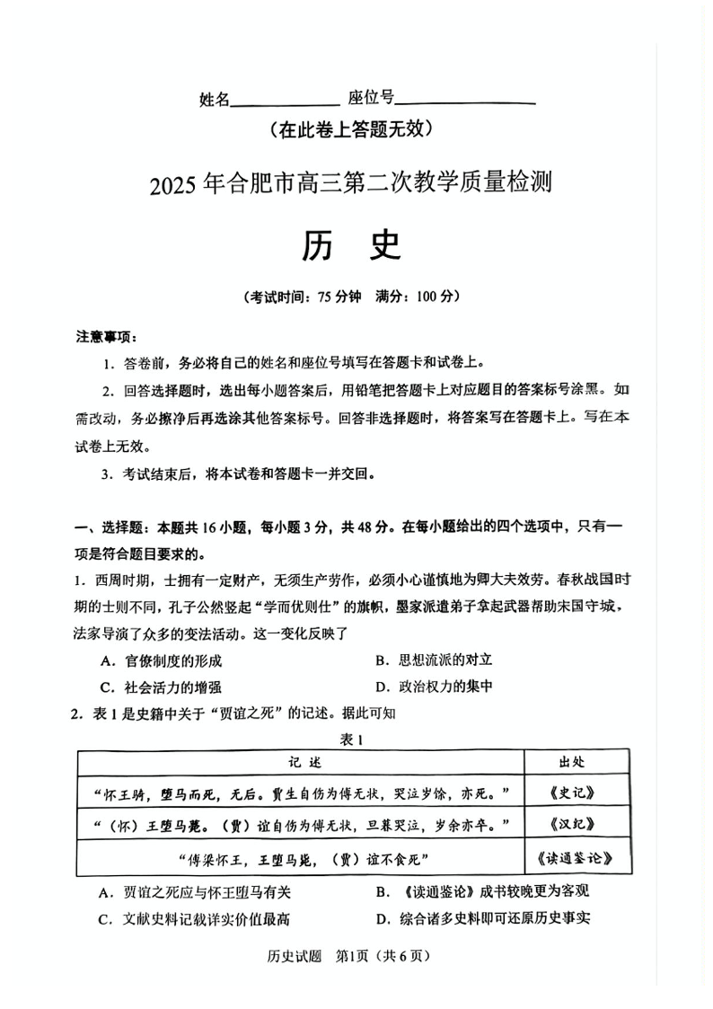 安徽省合肥市2025届高三第二次教学质量检测 历史.pdf