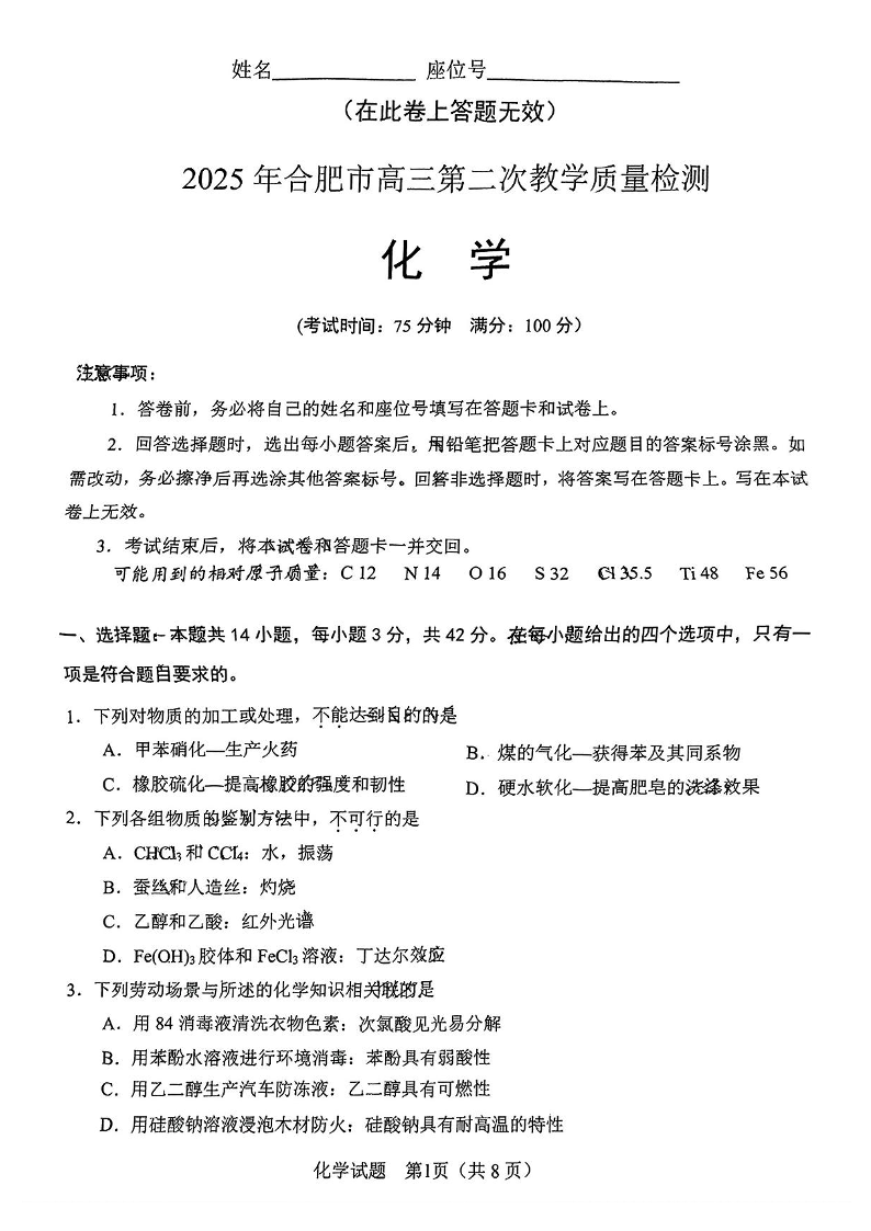 安徽省合肥市2025届高三第二次教学质量检测 化学.pdf