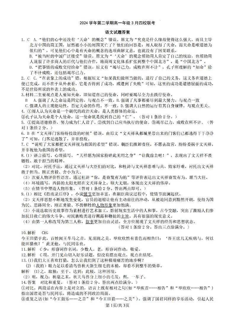 浙江四校联盟2024学年高一第二学期3月联考 语文答案.pdf