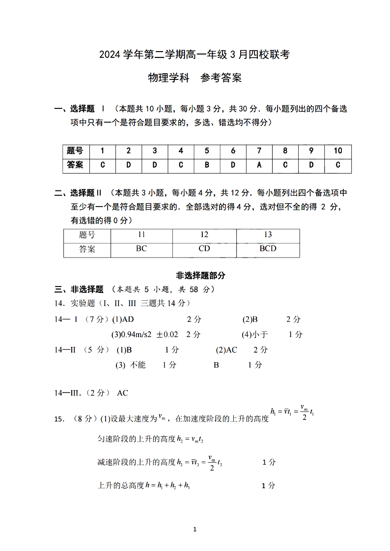 浙江四校联盟2024学年高一第二学期3月联考 物理答案.pdf