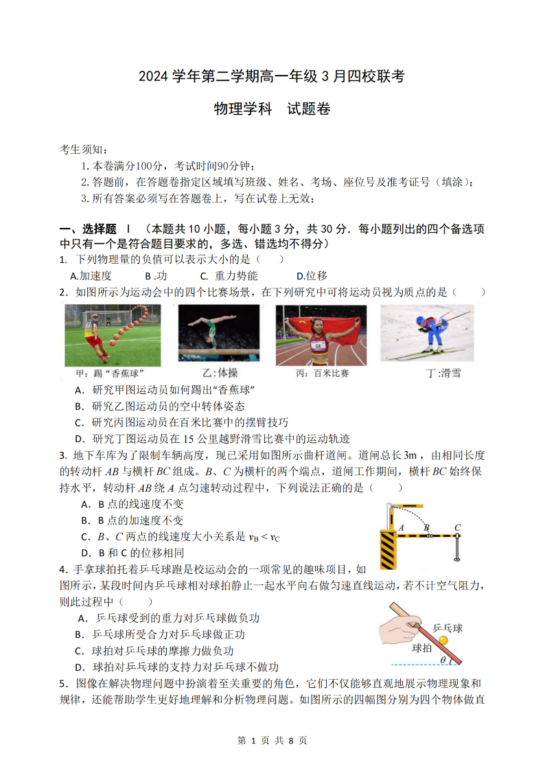 浙江四校联盟2024学年高一第二学期3月联考 物理.pdf