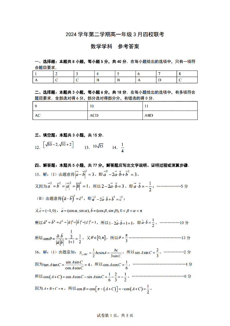 浙江四校联盟2024学年高一第二学期3月联考 数学答案.pdf