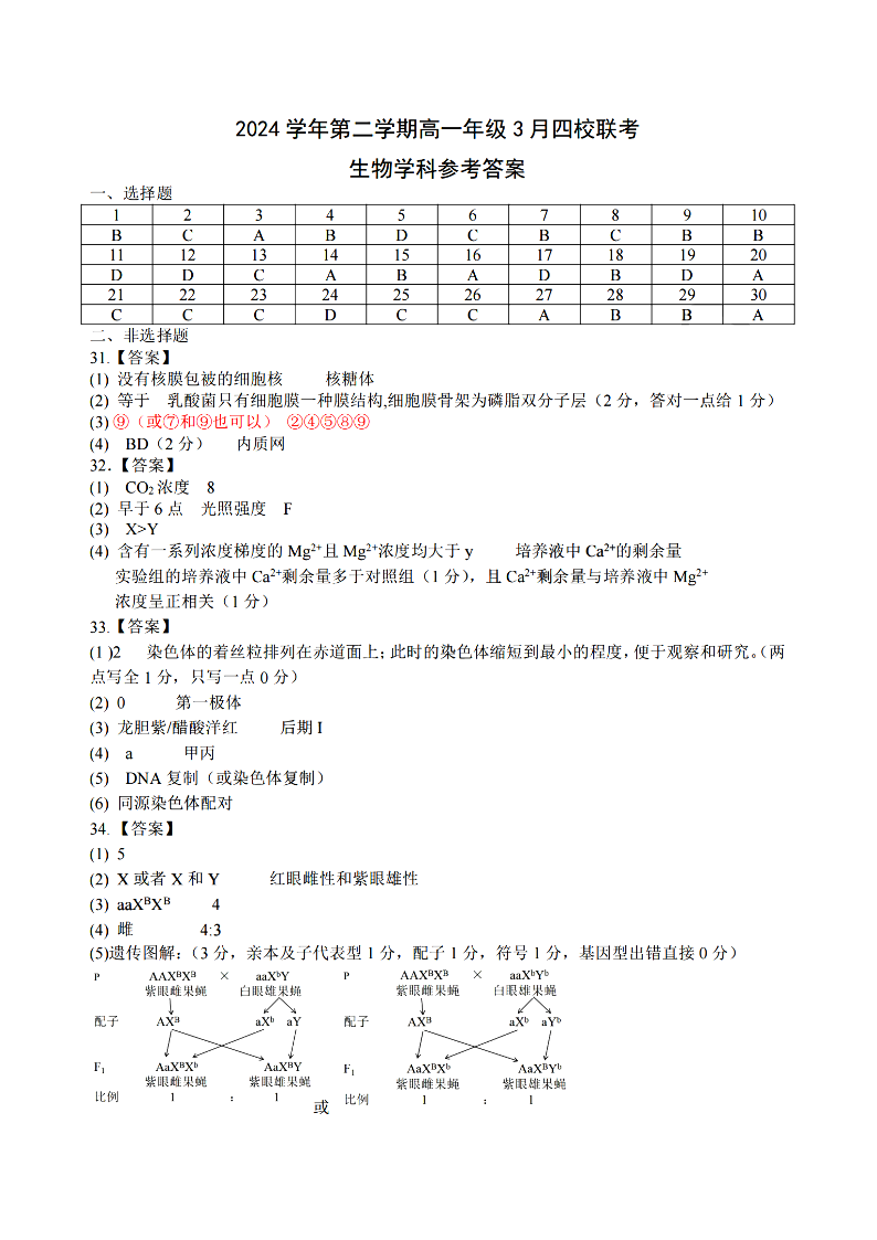 浙江四校联盟2024学年高一第二学期3月联考 生物答案.pdf