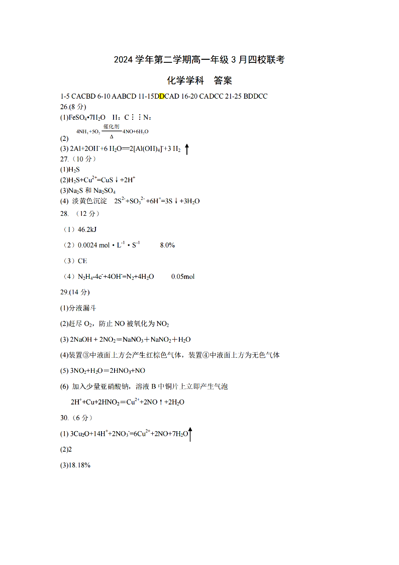 浙江四校联盟2024学年高一第二学期3月联考 化学答案.pdf