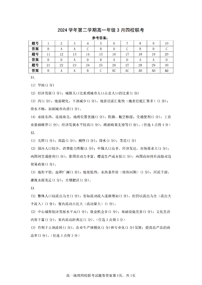 浙江四校联盟2024学年高一第二学期3月联考 地理答案.pdf