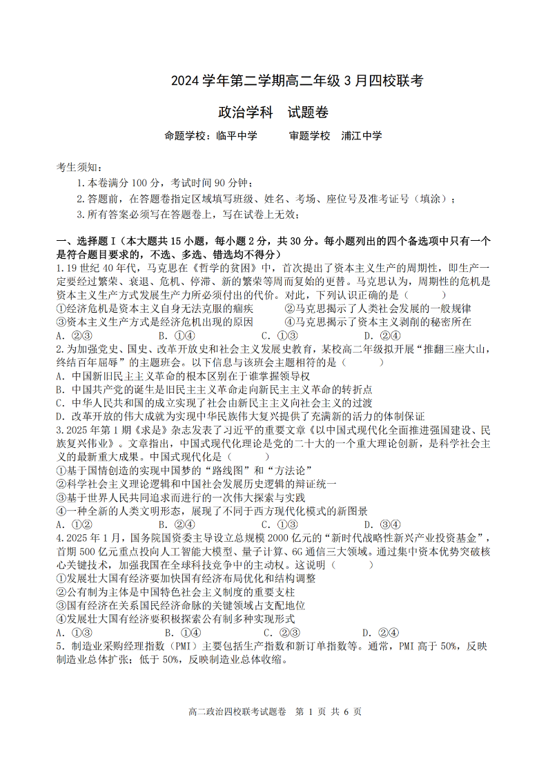 浙江四校联盟2024学年高二第二学期3月联考 政治.pdf