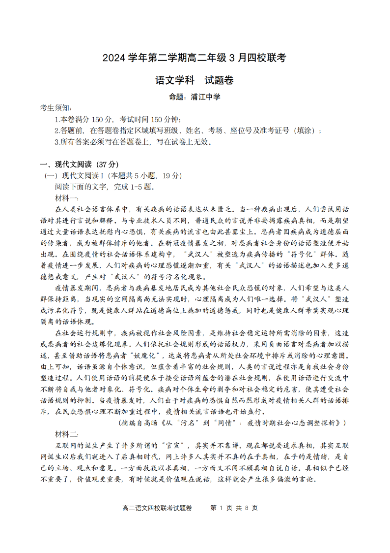 浙江四校联盟2024学年高二第二学期3月联考 语文.pdf