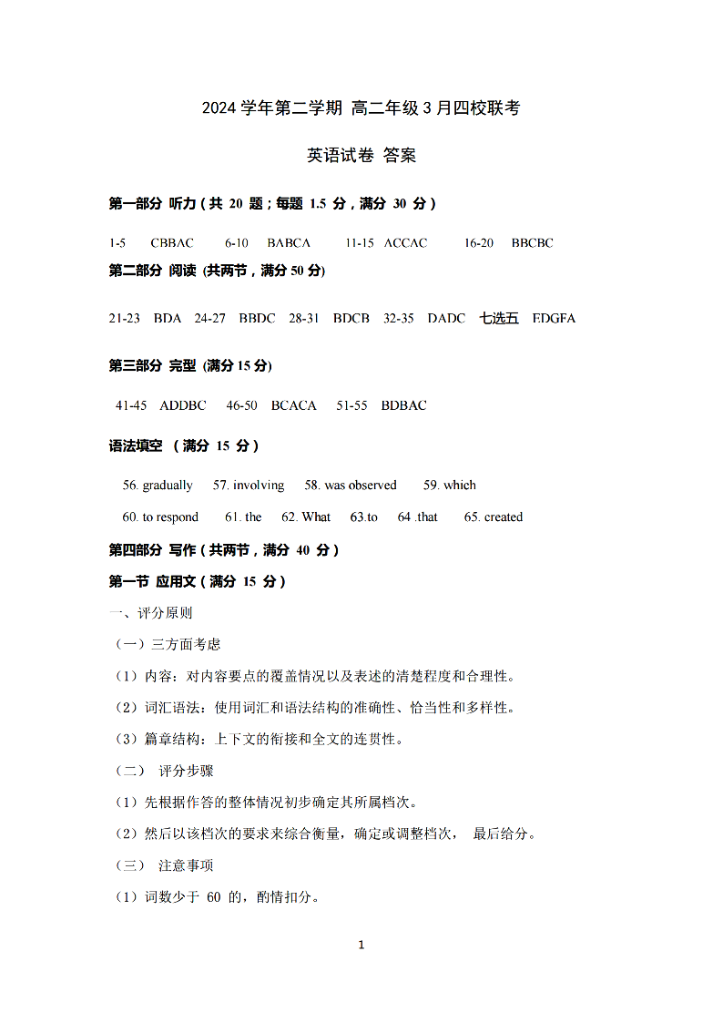 浙江四校联盟2024学年高二第二学期3月联考 英语答案.pdf