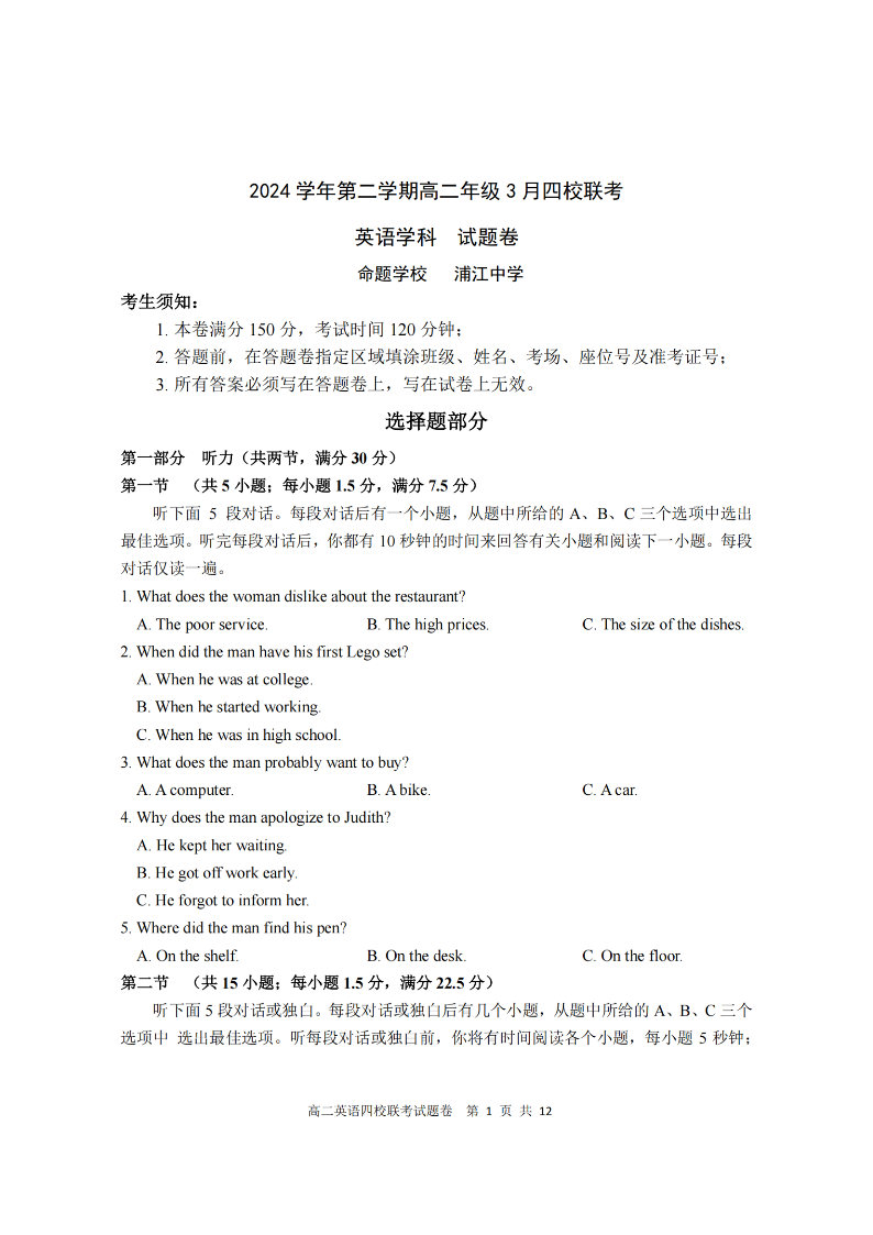 浙江四校联盟2024学年高二第二学期3月联考 英语.pdf